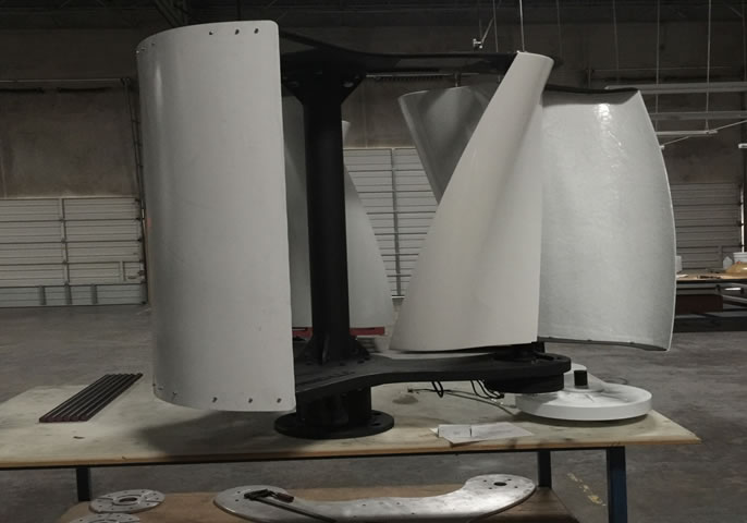 This design has 3 x 48” helix blades per side, designed to capture 360 degrees of air flow, with a low wind speed kick in of only 3-4 mph. Light weight of only 350 lbs. depending on generators, built from 6061 Aluminum that Is processed the same as commercial aircraft structures. We anodize the aluminum when required by coastal locations to prevent corrosion; all the fasteners are Stainless steel and blades are of composite or ABS plastic with UV protection to avoid any discoloration of the material over long periods of sun exposure. This system was designed with portability and quick install in mind. This system is fully customizable for decals on front deflector and or night lighting with a solar panel and battery system for special lighting effects or lactation beacons.
