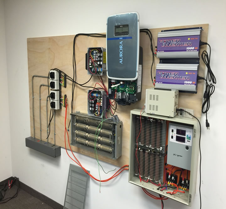 Testing Room: With both Grid tie and Sine Wave inverters, we are doing our best to ensure flexible connections. Shown below is a Grid tie ABB 2.0 UNO wind inverter. With rectifiers and dump load. Also a Missouri Wind 24 Volt Battery charger and 2 AC pure sine wave inverters.